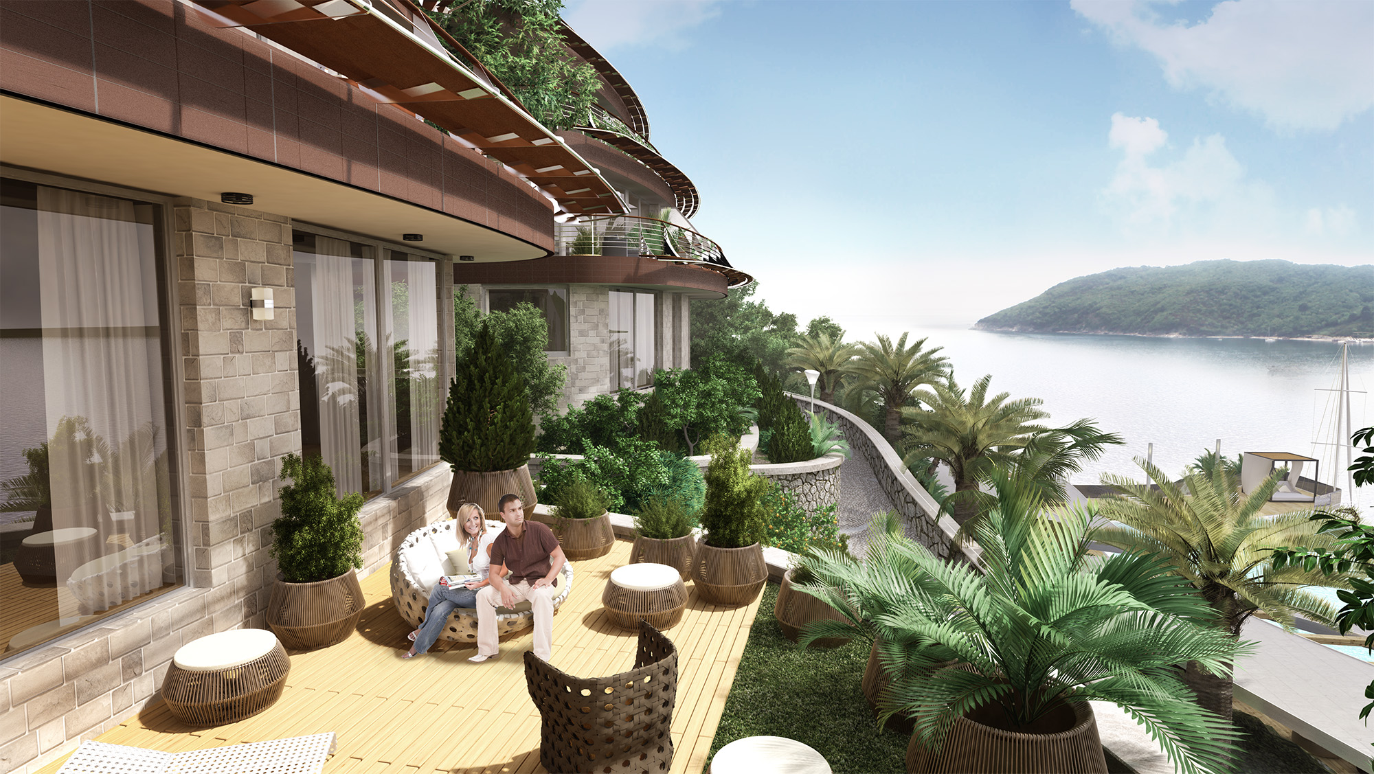 Из окон каждой резиденции открывается панорамный вид на кристально чистые воды Адриатического моря, величественные горные вершины и на Старый город Будвы. Здесь будут посажены смешанные сады из средиземноморских деревьев, которые создадут особый микроклимат «Dukley Gardens».